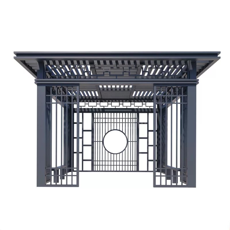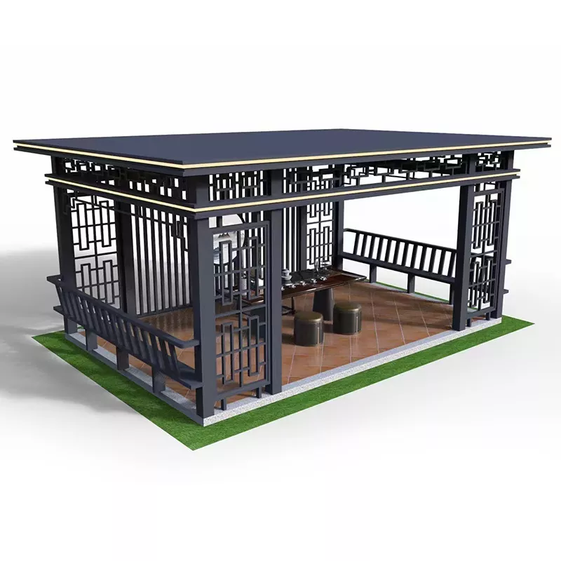 آلاچیق اوقات فراغت حیاط (3000×3000 میلی متر): ستون های 80×80 میلی متر، سقف کاشی سبز کوچک، مشبک های حلق آویز حک شده ساده، مناسب برای حیاط های خصوصی.