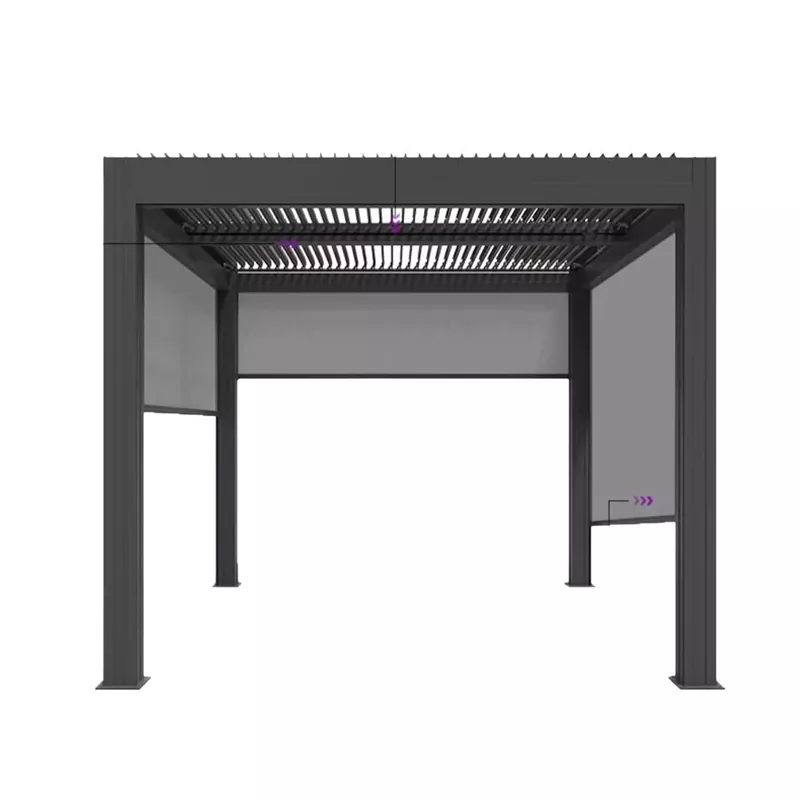 آلاچیق هوشمند حیاط (3000×3000 میلیمتر): ستونهای 60×60 میلیمتر، سقف شیشهای + آفتابگیر هوشمند، مناسب برای حیاطهای خصوصی؛